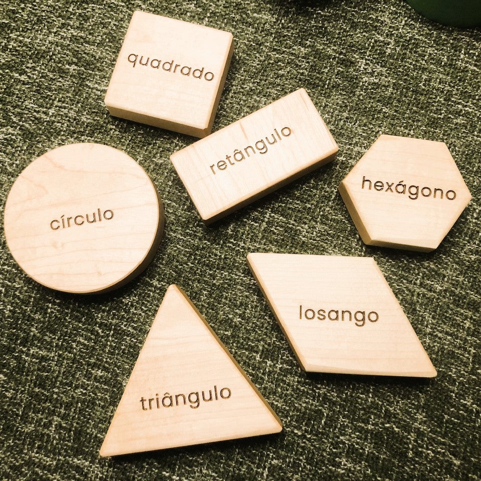 This small set includes a block in each of six shapes (circle, square, triangle, rectangle, rhombus and hexagon) with gems in six different colours (red, orange, yellow, green, blue and purple).